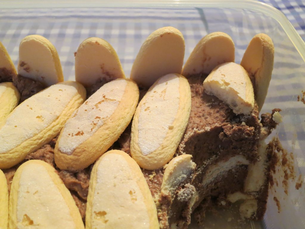 2 eierdooiers, 2 zakjes vanillesuiker, 250 g boter op kamertemperatuur, 500 g poedersuiker, 200 g grof geraspte zwarte chocolade, 200 g grof geraspte mekchocolade, 1 kopje lauwe melk en 2 dozen Madeirakoekjes