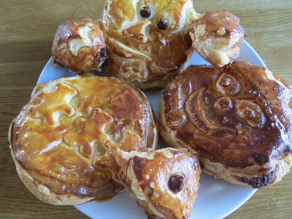 3 rollen kant-en-klaar bladerdeeg, 140 gr gesmolten boter, 180 gr amandelpoeder, 160 gr suiker, 2 eigelen voor het deeg en 2 eigelen voor de afwerking, een noot/boon