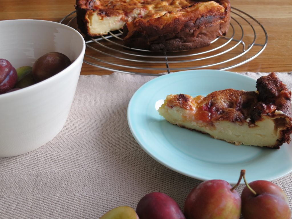 125 gr bloem, 125 gr suiker, 2 eetlepels vanillesuiker, 4 eieren, 1/2 zakje droge gist, 75 cl volle melk, snuifje zout, een tiental heel rijpe pruimen