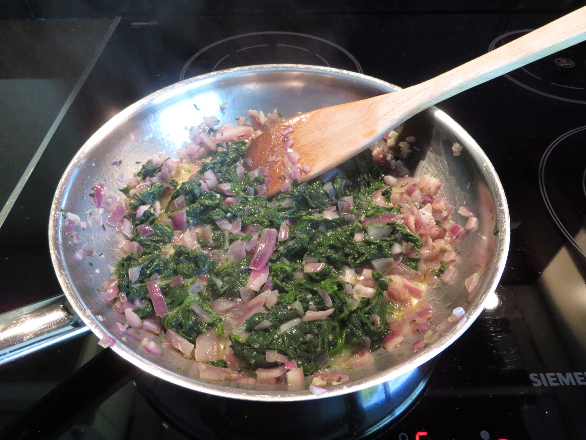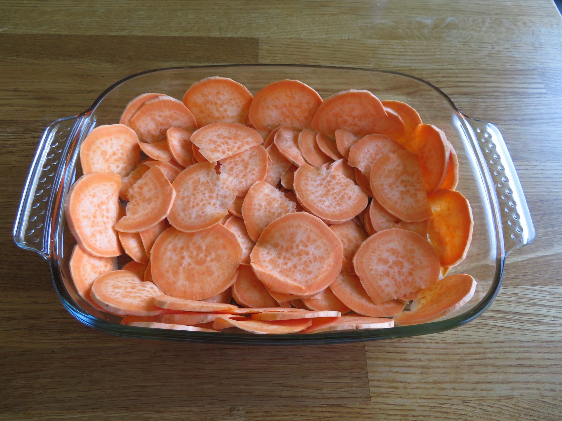 Boen de zoete aardappels schoon en snijd ze met de mandoline in dunne plakjes (ik deed het met de hand). Vet een ovenschaal in met olijfolie en schik de plakjes op de bodem en langs de kant, in meerdere laagjes. Sprenkel er olijfolie over en zet 10 minuten in de oven op 200 °C. Spoel de spinazie, laat slinken in een grote pot en vervolgens goed uitlekken in een vergiet. Snipper uit en look en stoof zacht met de tijm. Voeg de spinazie toe.