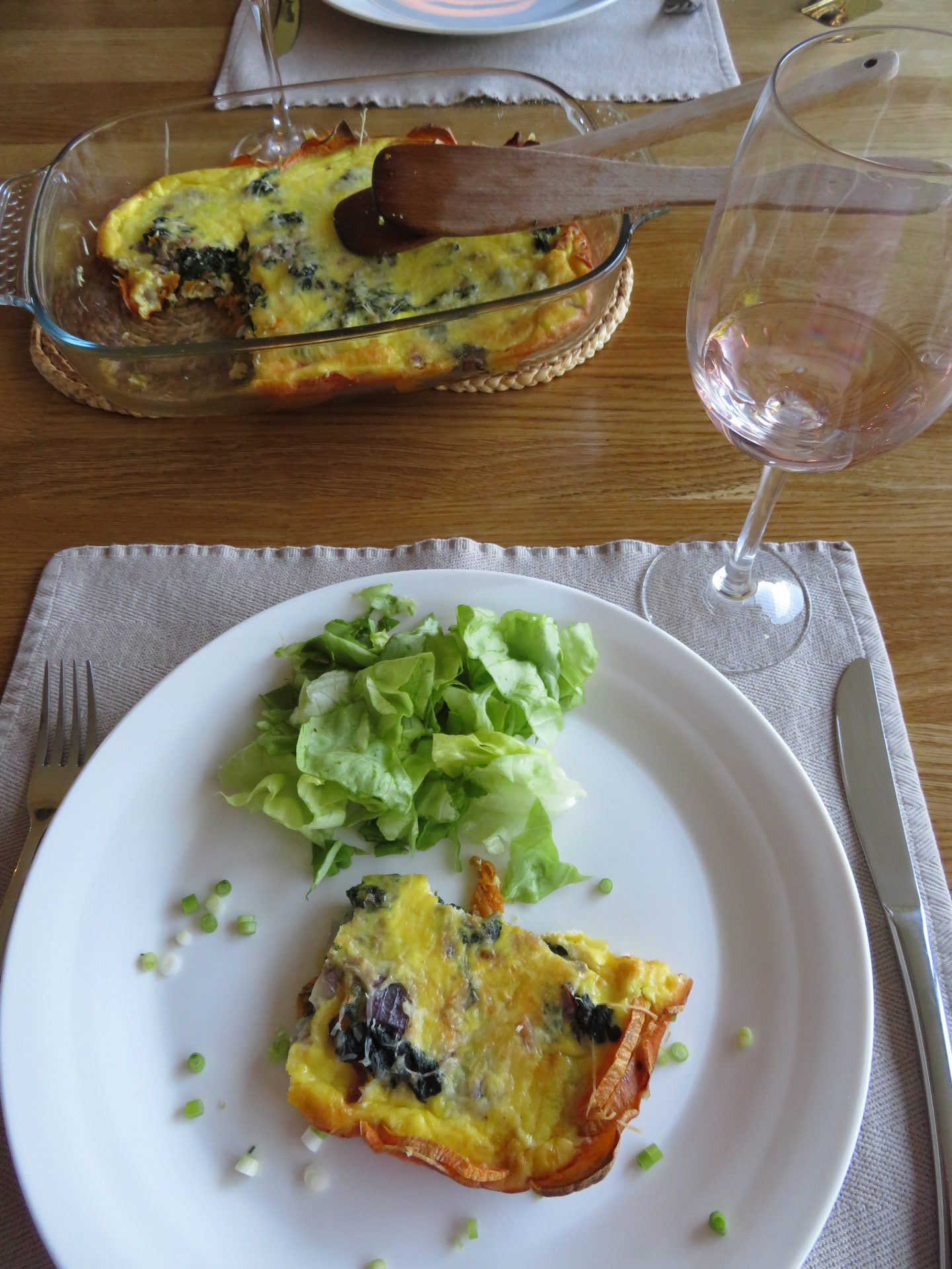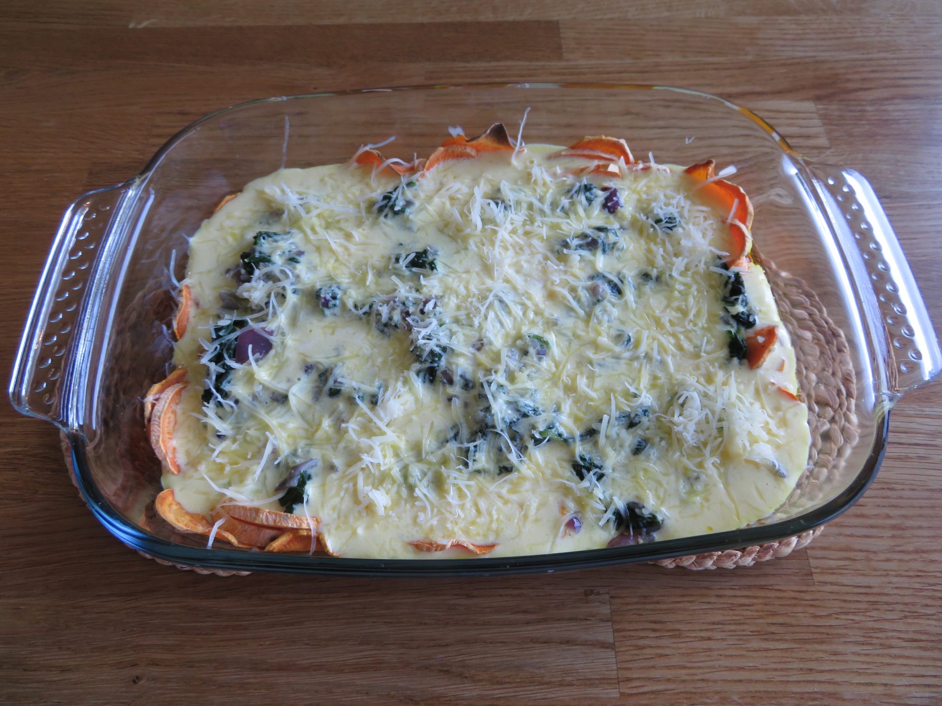 Als de zoete aardappelbodem klaar is, schik je de spinazie er op en overgiet je het geheel met het eier/kaasmengsel. Werk af met wat geraspte kaas. Bak in de oven gedurende ongeveer 15 minuten.