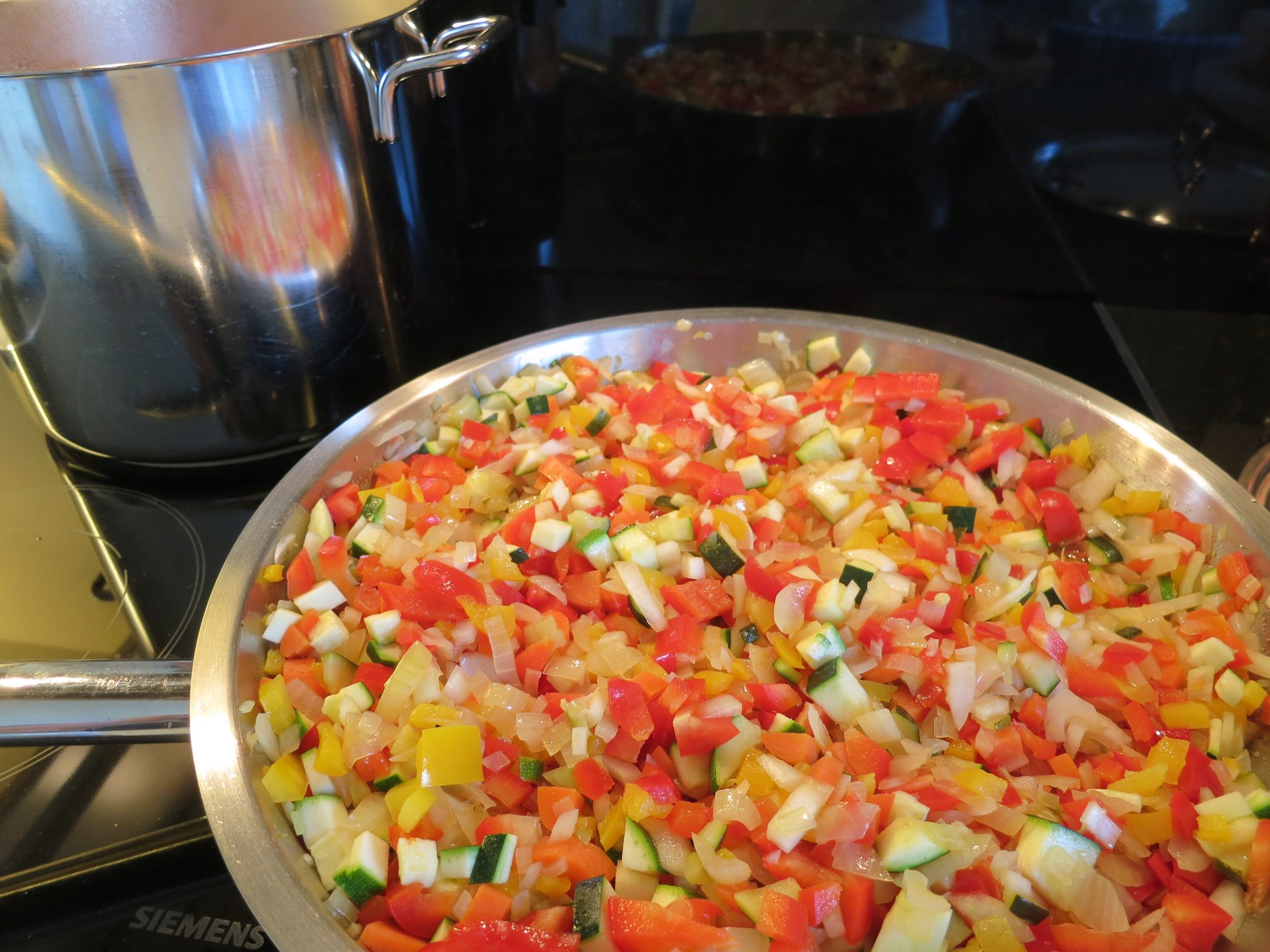 Ajuin, look, paprika’s in verschillende kleuren, tomaten en tomaten uit blik. Eventueel worteltjes en/of courgettes.